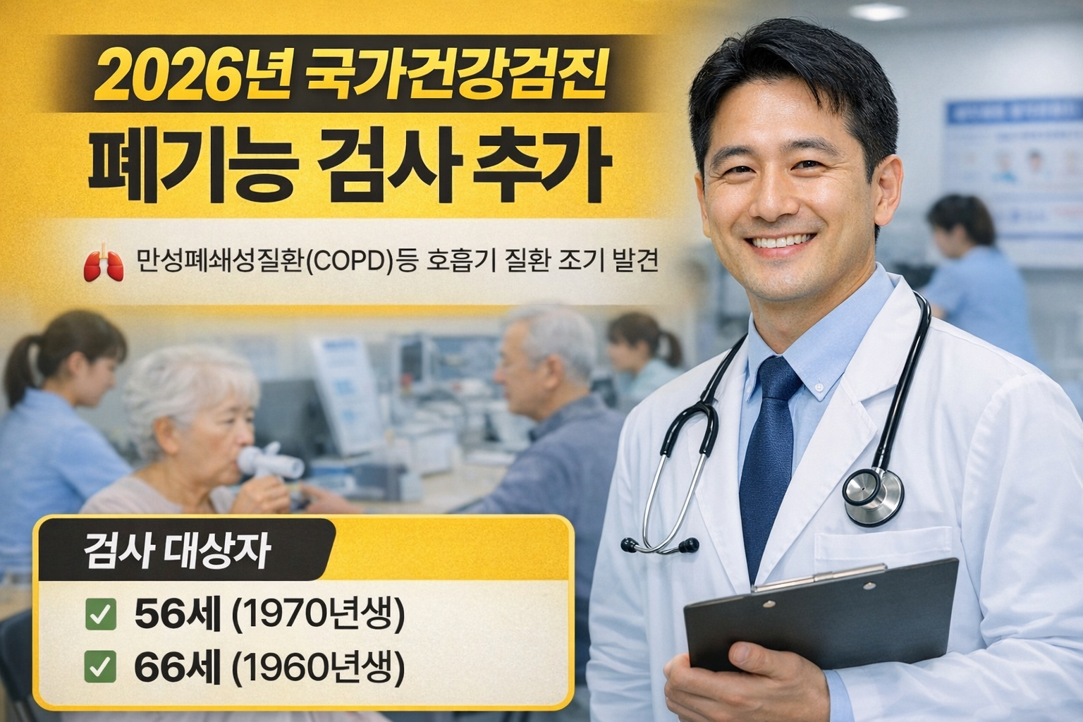 2026년부터는 폐기능 검사(폐활량 검사)가 국가건강검진 기본 항목에 추가됩니다.